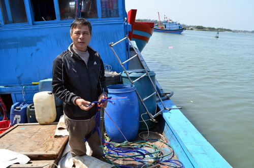 Ông Lựu cùng hệ thống dây lặn bị cắt còn sót lại. |