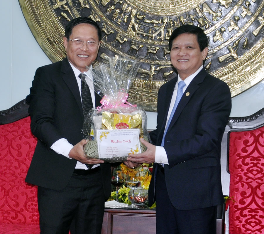Chủ tịch HĐND TP Nguyễn Nho Trung nhận quà Tết của Tổng lãnh sự Lào tại Đà Nẵng. |