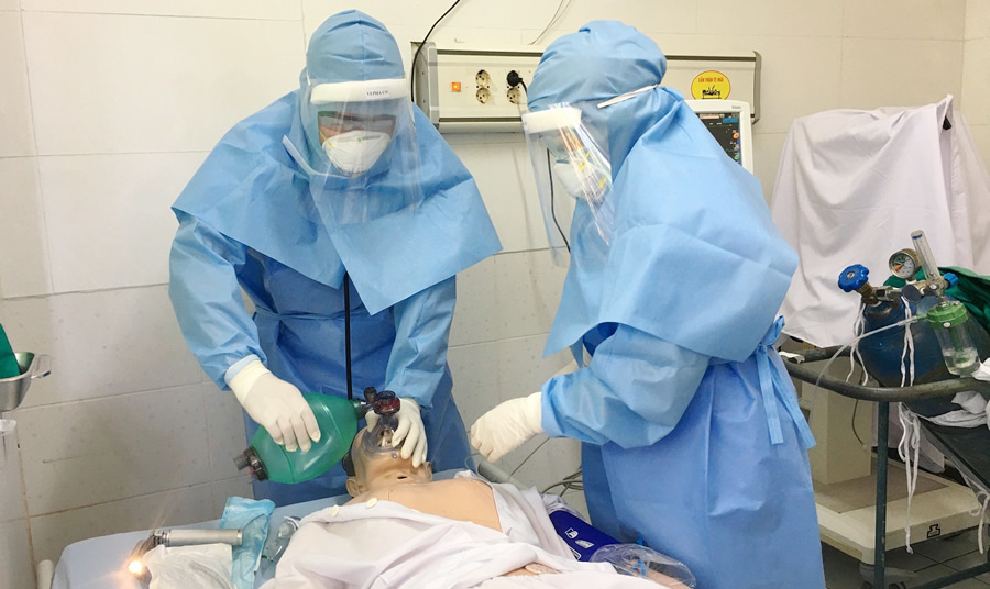 Bệnh viện Đa khoa Trung ương Quảng Nam diễn tập điều trị cấp cứu bệnh nhân nhiễm Covid-19. |