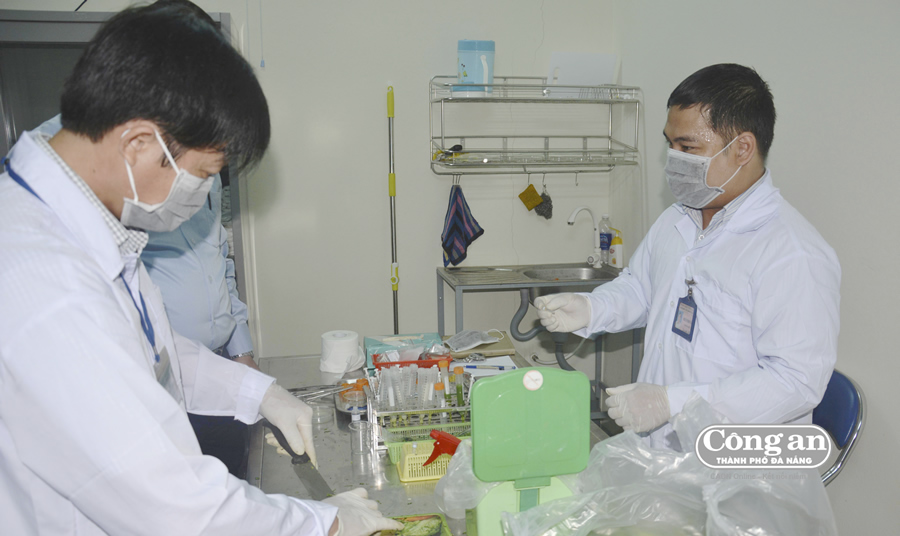| Lực lượng chức năng lấy mẫu test nhanh rau củ quả nhập về chợ Đầu mối Hòa Cường, Đà Nẵng. |