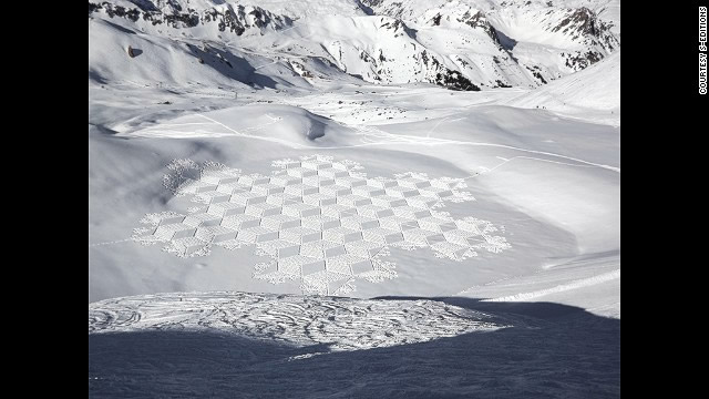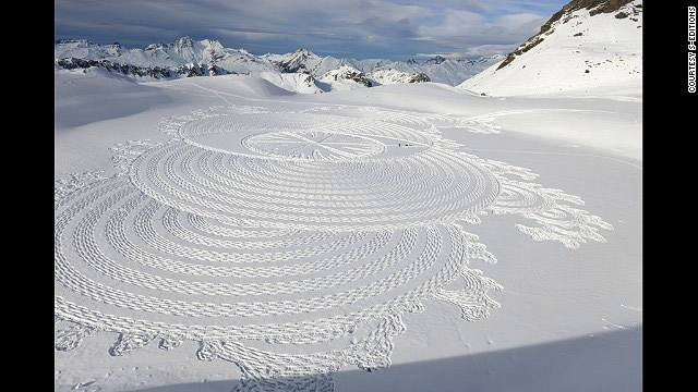Nghệ sĩ người Anh Simon Beck không cần sơn, đất sét hay kim loại để sáng tạo nghệ thuật khổng lồ. Thay vào đó, ông chỉ dựa vào thiên nhiên, đó là tuyết. Ông mất đến hơn 10 giờ mới hoàn thành mỗi bức tranh tuyết khổng lồ như thế này. Trong 10 năm qua, cứ mỗi mùa tuyết đến, ông lại khiến người xem đi từ bất ngờ đến ngưỡng mộ với mỗi tác phẩm của mình.