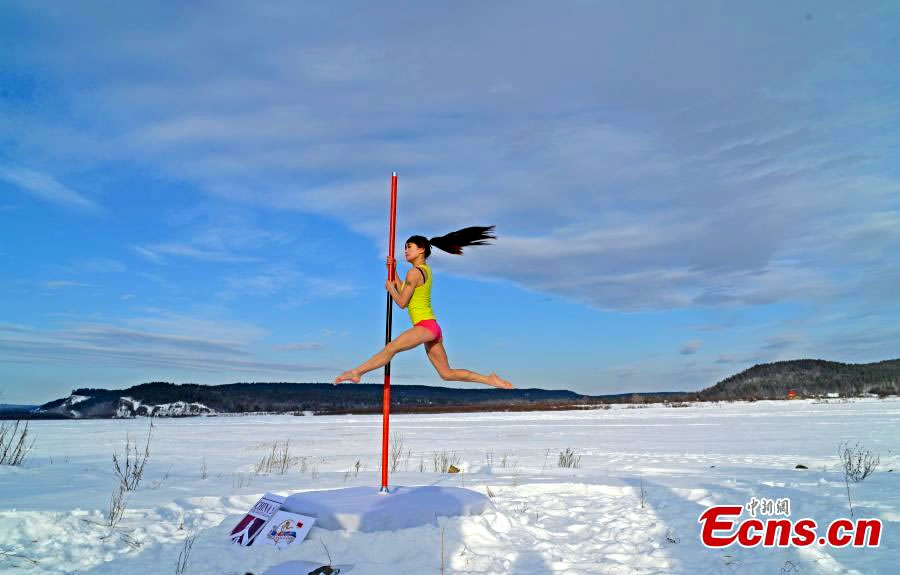 Một thành viên của đội múa cột Quốc gia của Trung Quốc liều mình thực hiện những màn múa ấn tượng trong khi nhiệt độ ngoài trời xuống đến -50 độ C tại làng Beiji, tỉnh Hắc Long Giang. Ngôi làng này, nằm ở điểm cực bắc Trung Quốc, tiếp giáp với Nga, và luôn rất lạnh lẽo.