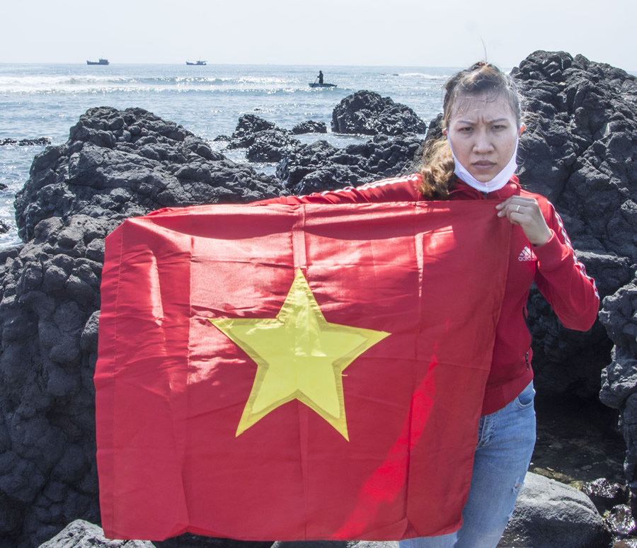 Chị Chi mang theo cờ Tổ quốc, ra mũi đất Ba Làng An, nơi gần Hoàng Sa nhất kể từ đất liền để ngóng trông con tàu trở về. |