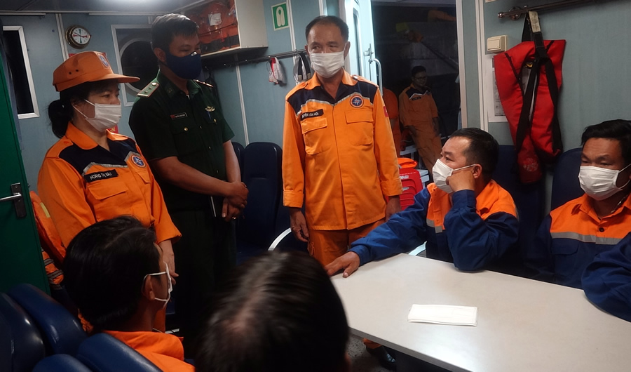 Trung tâm phối hợp tìm kiếm cứu nạn hàng hải khu vực II bàn giao ngư dân cho Bộ đội Biên phòng theo quy định. |