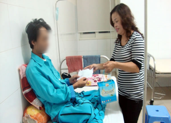 Y sĩ Trần Thị Kim Hạnh thăm, tặng quà bệnh nhân HIV đang điều trị tại bệnh viện. |
