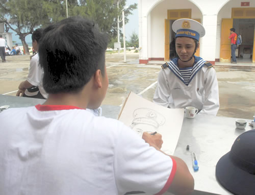 | Họa sĩ trẻ Trần Văn Thược ký họa chân dung cho chiến sĩ trên đảo Sinh Tồn Đông. |