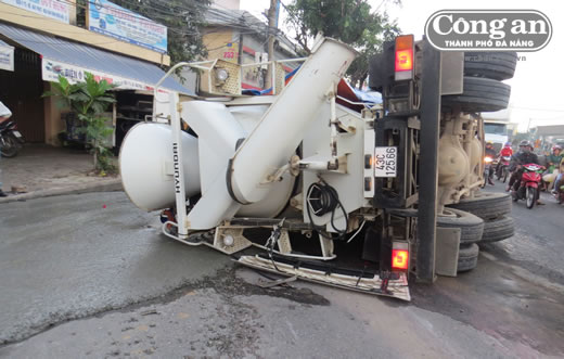 (Cadn.com.vn) - ĐÀ NẴNG- 4 giờ 30 ngày 14-11, anh Lê Văn Loan (1989, trú H.Thăng Bình, Quảng Nam) điều khiển xe bồn bê-tông BKS 43C -125.66 lưu thông trên tuyến đường Trường Chinh (đoạn thuộc địa bàn Q. Cẩm Lệ) bất ngờ mất lái, tự gây tai nạn. xe bồn leo lên dải phân cách cứng tông gãy 1 trụ điện chiếu sáng trước khi lật nghiêng. Hậu quả, ô-tô hư hỏng phần đầu, rất may là không có ai bị thương tích.