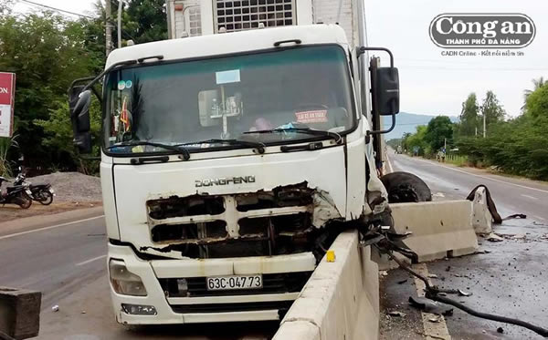 BÌNH ĐỊNH- Sáng 13-7, xe tải đông lạnh BKS 63C-047.73 do tài xế Nguyễn Thanh Nam (1975, trú H. Châu Thành, Tiền Giang) điều khiển lưu thông trên QL1A, khi đến đoạn qua xã Mỹ Phong đã va chạm với xe tải BKS 77C-040.55 do tài xế Tô Đình Chí (1969, trú H.Phù Mỹ) điều khiển chạy cùng chiều phía trước. Tiếp đó, xe tải đông lạnh lao tới, tông dải phân cách cứng. Rất may vụ tai nạn không xảy ra thương vong.