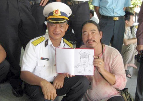 Etcetera Nguyễn tặng  tranh ký họa chân dung cho một sĩ quan Hải quân tại Trường Sa.