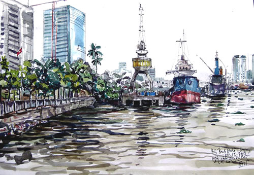 Tranh ký họa "Bến Bạch Đằng" của Etcetera Nguyễn.