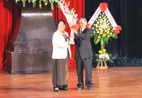 tặng hoa cho nguyên Chủ tịch nước Nguyễn Thị Bình.