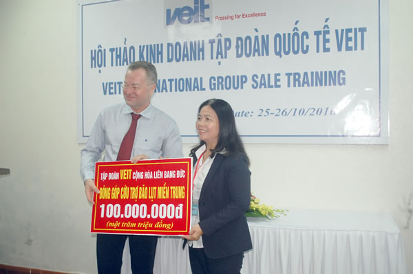 (Cadn.com.vn) - Ngày 25-10, trong khuôn khổ Hội thảo kinh doanh do Tập đoàn Quốc tế VEIT (CHLB Đức) phối hợp với Cty CP Dệt may 29-3 (Hachiba) tổ chức tại Đà Nẵng, ông Gunter Veit, Chủ tịch Tập đoàn Veit, một đối tác lâu năm của Hachiba về chiến lược kinh doanh trong ngành may mặc đã trao số tiền 100 triệu đồng ủng hộ đồng bào bị lũ lụt tại miền Trung thông qua bà Lê Thị Thái Dương, Phó Chủ tịch UBMTTQ Việt Nam TP Đà Nẵng. Dịp này, Hachiba cũng đã vận động toàn thể CBCNV, người lao động trích 1 ngày lương ủng hộ thêm 100 triệu đồng. Toàn bộ số tiền trên đã được trao ngay tại ngày đầu tiên khai mạc hội thảo.