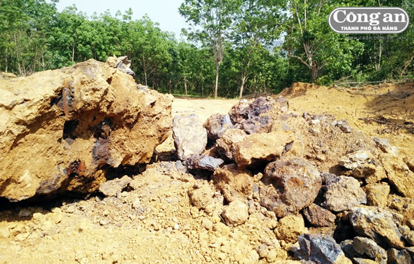 | Quặng sắt Laterit được khai thác nhưng các đối tượng chưa kịp đưa ra khỏi hiện trường. |
