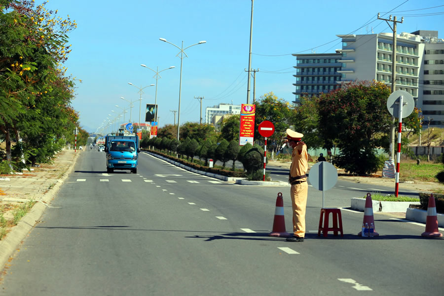 Lực lượng Công an làm nhiệm vụ tại khu vực chốt ở Điện Bàn. |