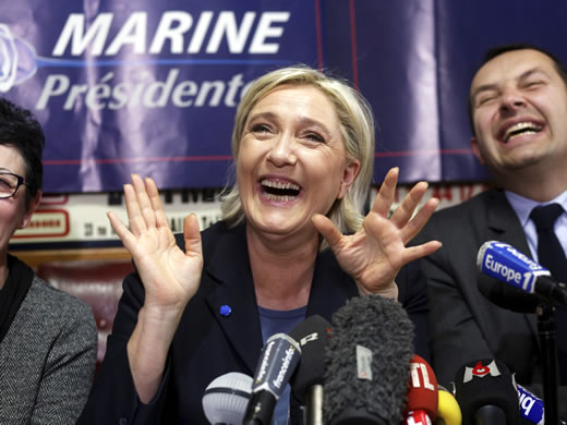 Trong bối cảnh ứng cử viên phe trung hữu Francois Fillon đang phải chịu sức ép rút lui trong cuộc đua vào Điện Elysee sau khi báo chí Pháp phanh phui bê bối vợ ông nhận mức lương tương đương trợ lý nghị sĩ nhưng thực tế lại không làm việc, và vụ tấn công tại bảo tàng Louvre hôm 3-2, khi một người đàn ông cầm dao tấn công một nhóm binh sĩ và bị cảnh sát bắn trọng thương, bà Le Pen ghi điểm với các chính sách an ninh, đạo Hồi và người nhập cư của mình.