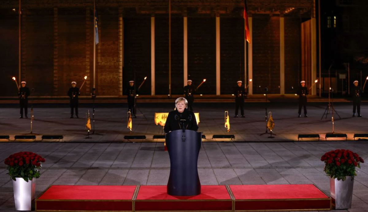 Do diễn ra trong bối cảnh đại dịch COVID-19 nên buổi lễ hạn chế khách mời so với truyền thống các sự kiện tương tự trước đây. Trong bài phát biểu ngắn trước khi bắt đầu sự kiện trong khuôn viên Bộ Quốc phòng Đức ở Berlin, Thủ tướng Merkel bày tỏ lòng biết ơn về sự hợp tác, sự hy sinh và tận tụy với công việc của tất cả các lực lượng, đặc biệt là những người đang phải đương đầu với đại dịch COVID-19. Thủ tướng Merkel cũng điểm lại 16 năm đứng đầu Chính phủ Đức với đầy những sự kiện và thách thức, cả về phương diện chính trị lẫn con người, từ cuộc khủng hoảng kinh tế và tài chính năm 2008 đến khủng hoảng người di cư năm 2015. Theo bà, các cuộc khủng hoảng đã cho thấy rõ tầm quan trọng của hợp tác đa phương để có thể giải quyết các thách thức hiện nay như biến đổi khí hậu, số hóa, vấn đề người tị nạn và di cư. Thủ tướng Merkel cũng gửi lời chúc mừng tốt đẹp nhất tới người sắp kế nhiệm mình là ông Olaf Scholz trong nỗ lực đưa nước Đức vượt qua mọi thách thức phía trước.