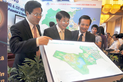 | Lãnh đạo TP Đà Nẵng giới thiệu mô hình KCNC cho các đối tác tại Hội nghị xúc tiến đầu tư diễn ra đầu năm 2014. |