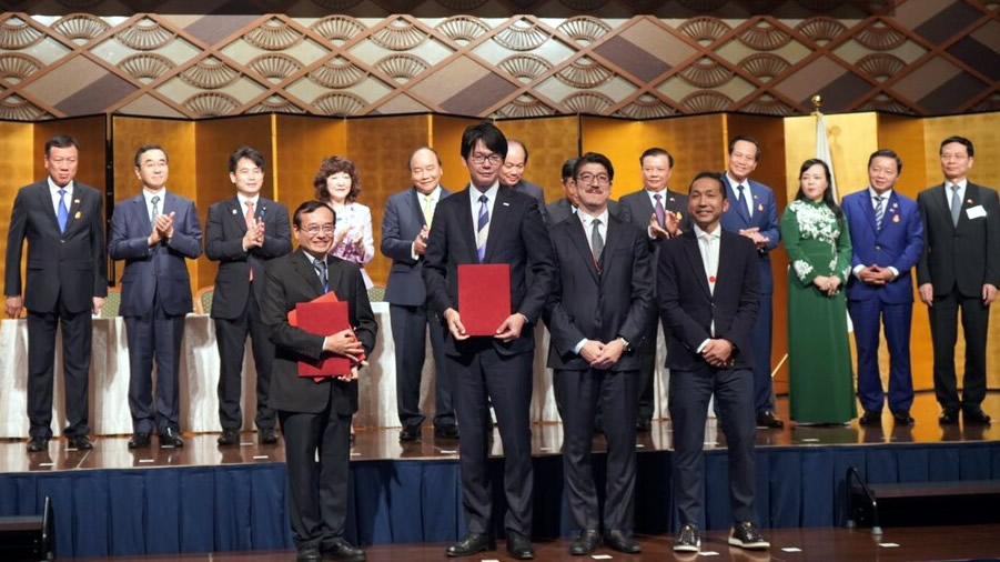 Ông Lương Minh Sâm – Phó Hiệu trưởng ĐH Đông Á và ông Kenji Yabuno - Chủ tịch tập đoàn Cookbiz cùng các công ty dịch vụ thực phẩm địa phương Nhật ký kết hợp tác. |