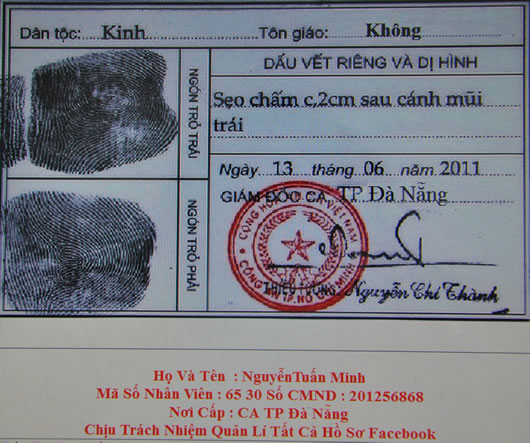 Cụ thể, CMND này “được cấp” vào ngày 13-6-2011 nhưng nơi đăng ký HKTT lại ghi “Hòa Khánh Bắc, Hòa Vang, Đà Nẵng” (thực tế là Hòa Khánh Bắc, Q. Liên Chiểu, Đà Nẵng). Và một thông tin để lộ rõ chân tướng của hành vi lừa đảo là chữ ký, con dấu trên giấy CMND này là của Giám đốc CATP Đà Nẵng nhưng lại mang tên “Thiếu tướng Nguyễn Chí Thành”! Còn nữa, phía dưới chứng minh tên Cường, nhưng các đối tượng lại ghi “Nguyễn Tuấn Minh”.