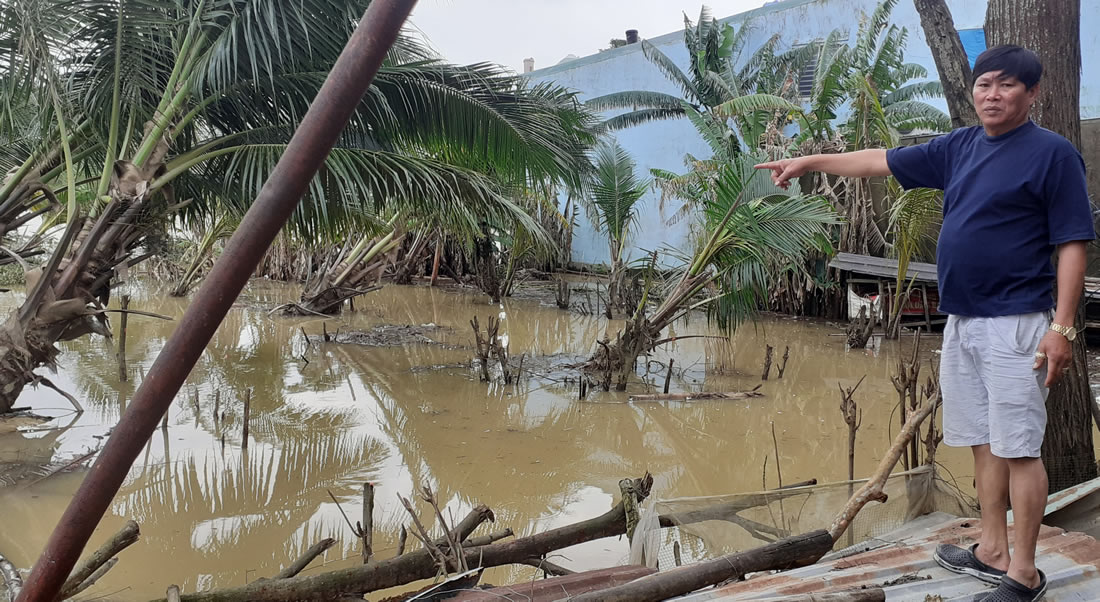 Hàng chục hộ dân ở thôn Đông Hòa ngập trong nước, do thấp trũng, không có hệ thống thoát nước. |