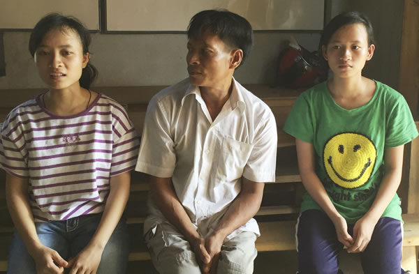 | Anh Thống thầm trách do mình nghèo nên không có tiền lo cho con đi học. Trong ảnh, anh Thống bên cạnh 2 con gái Huệ, Thanh vừa đỗ đại học. |