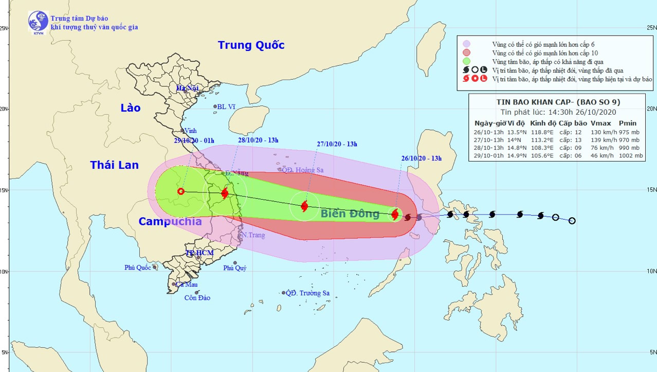 Về diễn biến của bão số 9, ông Trần Quang Năng, Trưởng phòng dự báo thời tiết Trung tâm Dự báo khí tượng thủy văn quốc gia cho hay, đây có thể cơn bão mạnh nhất, lớn nhất kể từ đầu mùa mưa bão năm nay. Đến chiều 26/10, Trung tâm xác định bão số 9 có cường độ cấp 12, giật cấp 15.