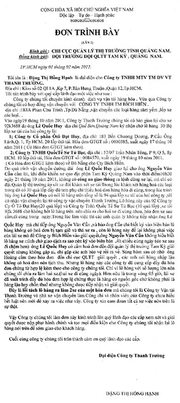 Văn bản Cty Thanh Trường gửi cơ quan chức năng tỉnh Quảng Nam. |