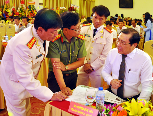 Về phía CATP có các đồng chí: Đại tá Lê Văn Tam, Ủy viên Ban Thường vụ Thành ủy, Bí thư Đảng ủy, Giám đốc CATP; Đại tá Lê Thanh Hải, Thành ủy viên, Phó Bí thư Đảng ủy, Phó Giám đốc cùng đại diện lãnh đạo CA các đơn vị, địa phương thuộc CATP.