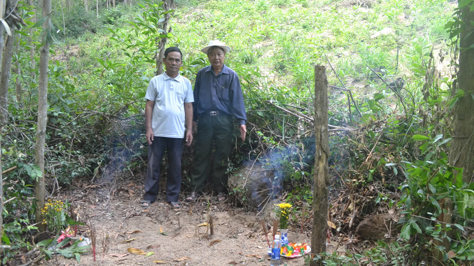 Đại tá Mai Quý Trung và ông Phạm Tấn Ba bên ngôi mộ Liệt sĩ Nguyễn Thị Én chuẩn bị cất bốc. |