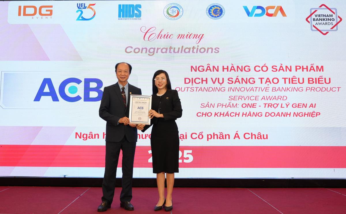 Ngày 22-9, Ngân hàng TMCP Á Châu (ACB) cho biết, ACB vinh dự giành hai giải thưởng quan trọng "Ngân hàng Bán lẻ tiêu biểu" và "Ngân hàng có Sản phẩm dịch vụ Sáng tạo" tại Lễ trao Giải thưởng Ngân hàng Việt Nam tiêu biểu (Vietnam Outstanding Banking Awards - VOBA) 2025. VOBA là giải thưởng thường niên do Tập đoàn Dữ liệu Quốc tế (IDG) phối hợp cùng Hiệp hội Ngân hàng Việt Nam và nhiều cơ quan chuyên ngành tổ chức.