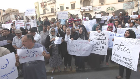Biểu tình ở Benghazi, Libya lên án vụ tấn công Lãnh sự quán Mỹ. Ảnh: CNN |