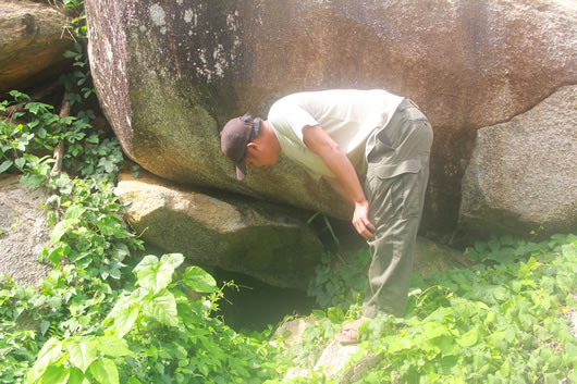 Anh Nguyễn Kỳ chỉ những hốc núi nơi trăn sinh sống trên rừng Già. |