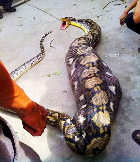 Tối 9-12, con bò mẹ của chị Lê Thị Bé (40 tuổi, trú thôn Phú Cốc Tây, xã Quế Thọ) từ trên núi chạy về chuồng mà không có con bê 4 tháng tuổi đi theo. Nghĩ bê bị lạc, sáng sớm hôm sau chị Bé đưa bò mẹ lên núi tìm. Khi vào khu vực rừng Già khoảng vài trăm mét, chị Bé hốt hoảng khi thấy con trăn lớn nằm cuộn mình với cái bụng căng tròn bên một vũng nước. Sau vài phút trấn tĩnh, chị Bé mới hoàn hồn rồi chạy về thôn báo tin. 7 thanh niên trong làng lập tức lên núi khống chế, khiêng con trăn về nhà giết thịt. Sau khi lấy con bê nặng 30 kg ra, người dân cân con trăn nặng hơn 30 kg, dài 5m. Theo chị Bé, từ đầu năm đến nay, đây là con bê thứ 4 của gia đình bị mất. "Xưa nay chỉ nghe nói nhưng không chứng kiến trăn nuốt trọn con bê to như vậy. Quá khủng khiếp, giờ thấy vậy nên ai cũng lo lắng, lùa hết gia súc về nhà", ông Lê Văn Ngũ (62 tuổi, hàng xóm chị Bé) nói.