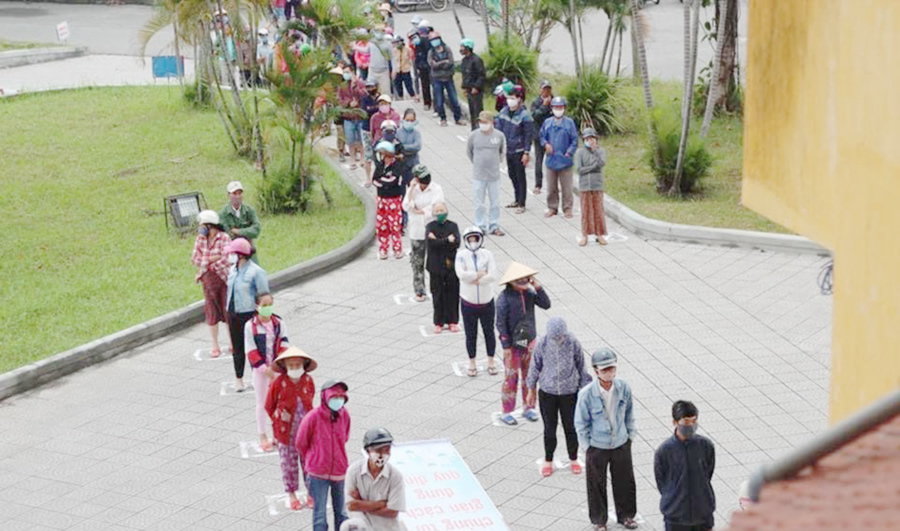 Người dân đến "ATM gạo" xếp hàng giữ khoảng cách quy định. |