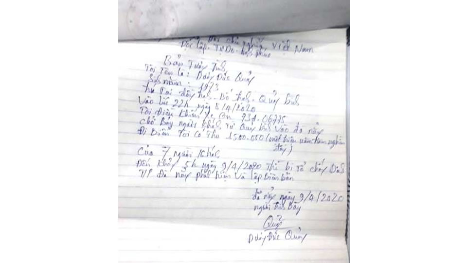 Dù đã có lệnh cấm phương tiện vận chuyển khách nhưng Dương Đức Quảng (trú tỉnh Quảng Bình) vẫn phớt lờ, nhận chở 7 khách từ Quảng Bình vào Đà Nẵng chơi bằng ô-tô BKS 73A-067.755 với giá hợp đồng 1,5 triệu đồng. Chuyến đi bất chấp lệnh cấm của tài xế Quảng đã bị lực lượng CSGT CATP Đà Nẵng tham gia phòng chống Covid-19 tại phía Nam hầm Hải Vân (Đà Nẵng) phát hiện lúc 5 giờ 30 ngày 9-4. Lực lượng CSGT CATP Đà Nẵng đã lập biên bản xử phạt hành chính đối với tài xế Quảng mức 6 triệu đồng về lỗi chở khách không có phù hiệu và tước GPLX 2 tháng.
