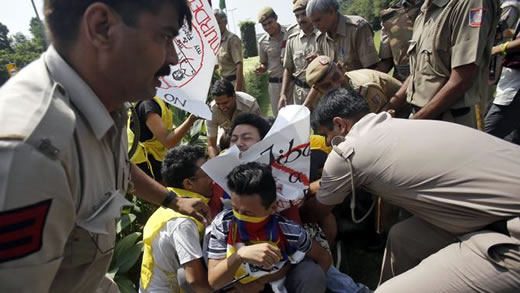 | Cảnh sát Ấn Độ bắt giữ những người biểu tình Tây Tạng phản đối chuyến thăm của Chủ tịch Trung Quốc hôm 17-9. Ảnh: Reuters |