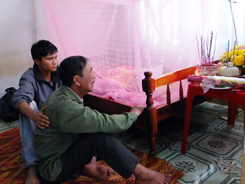 Buổi chiều 25-2, chúng tôi cũng tìm về gia đình của em Trần Văn Dung tại thôn 3, xã Tân Lập, H. Krông Buk. Sau khi cơ quan chức năng khám nghiệm tử thi, thi thể em Dung đã được gia đình đưa về khâm liệm. Ông Trần Văn Nam (1965, bố của Dung) cùng đứa con trai thứ hai đang tổ chức cầu siêu và thủ tục cho đám tang. Người anh đầu của Dung đang là sinh viên tại TPHCM cũng nhận được tin báo và đang trên đường về. Có mặt tại đây từ sáng tới giờ, anh Nguyễn Xuân Quang, cậu ruột của Đạt kể chuyện Đạt sau khi gây án chạy đi tìm mình lúc sáng. Anh bảo, “bất ngờ và đau lòng nhiều lắm, vì thằng nhỏ ngoan, học hành tử tế, nào ngờ...”. Khi nhận được tin, anh cùng vợ đang làm rẫy cà-phê vội chạy lên bệnh viện rồi quay về đây để lo đám tang với gia đình người bị hại...