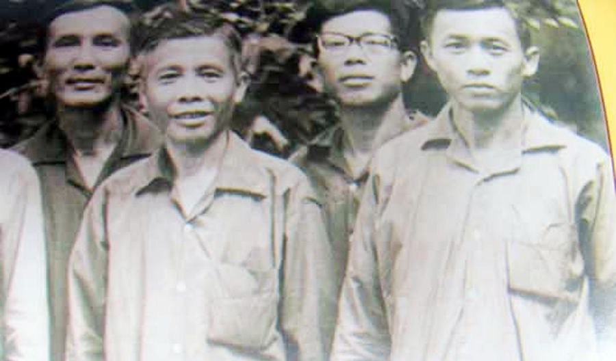| Hàng trước: Ông Hoàng Văn Lai (phải) và ông Hoàng Quốc Dân tại căn cứ Ban An ninh khu 5. |