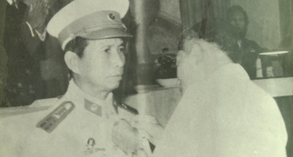 Ông Hồ Nghinh trao danh hiệu Anh hùng LLVTND cho chiến sĩ cảnh vệ Trần Văn Tư. |