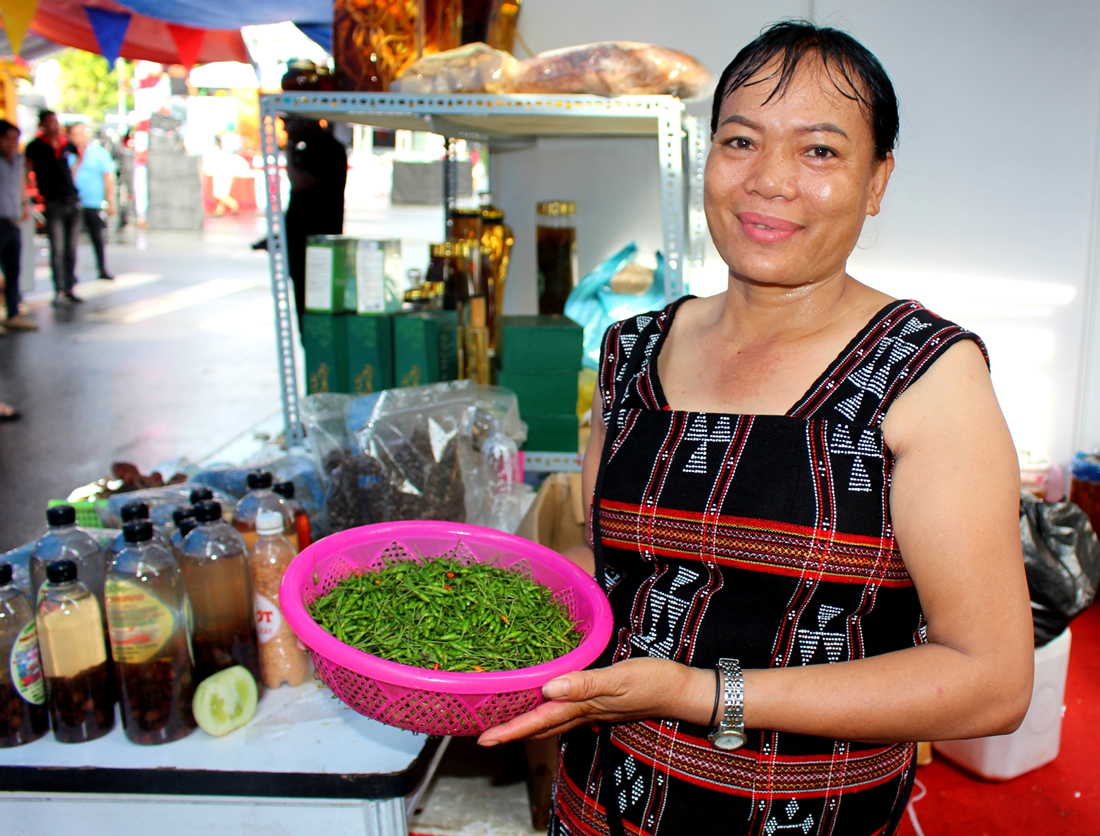 Cô gái Cơ Tu giới thiệu tiêu rừng tại Hội chợ Quảng Nam. |