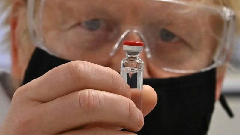 Thủ tướng Anh Boris Johnason cầm lọ vaccine của Đại học Oxford/AstraZeneca. Ảnh: Getty Images |