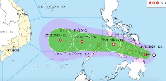Dự báo đến 13 giờ ngày 25-11, áp thấp nhiệt đới ở khoảng 11,1 độ Vĩ Bắc; 121,7 độ Kinh Đông, trên khu vực miền Trung Philippines. Cường độ dự báo đạt cấp 7, giật cấp 9, di chuyển theo hướng Tây Tây Bắc, tốc độ khoảng 20-25 km/giờ.