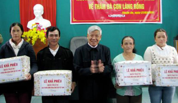 Nguyên Tổng Bí thư Lê Khả Phiêu trong một lần đến thăm và trao quà cho người dân làng Rồng. |