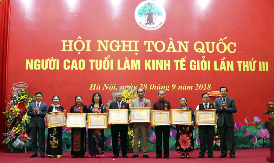 | Bác sĩ Vũ Thị Tư Hằng (thứ 4 từ trái qua) nhận Bằng khen của Thủ tướng Chính phủ tại Hội nghị toàn quốc Người cao tuổi làm kinh tế giỏi, tháng 9-2018. |