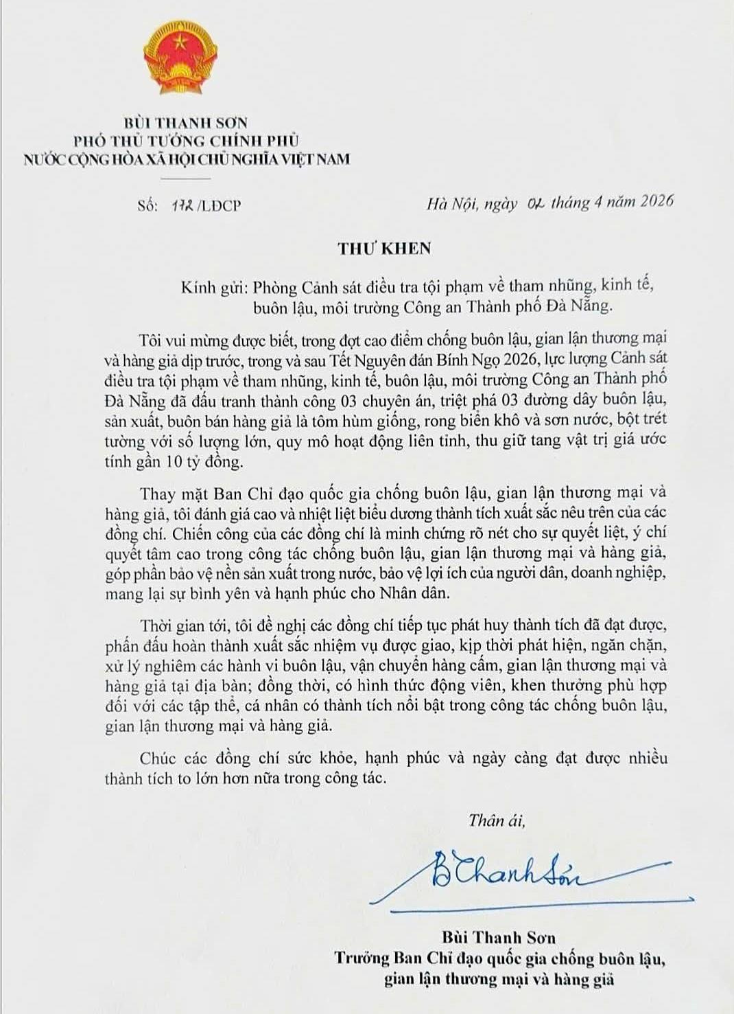 Những nỗ lực, cố gắng và thành tích đạt được của lực lượng CSKT Công an TP Đà Nẵng đã được ghi nhận ở cấp Trung ương. Mới đây, Phó Thủ tướng Chính phủ, Trưởng Ban Chỉ đạo quốc gia chống buôn lậu, gian lận thương mại và hàng giả Bùi Thanh Sơn đã gửi thư khen, biểu dương những thành tích xuất sắc của lực lượng CSKT Công an TP Đà Nẵng.