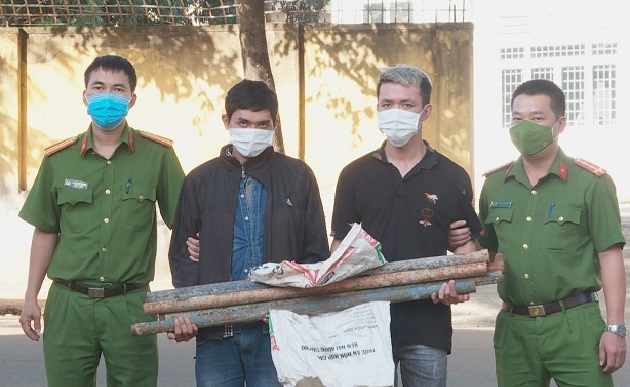 Hai đối tượng Thế Anh và Trung Hiếu (đứng giữa) bị bắt giữ.