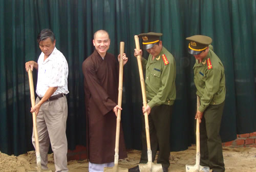 | Lãnh đạo CATP Đà Nẵng, Báo Công an TP Đà Nẵng và Đại đức Thích Thông Đạo - Đại diện Chùa Bà Đa tại lễ động thổ, khởi công công trình. |