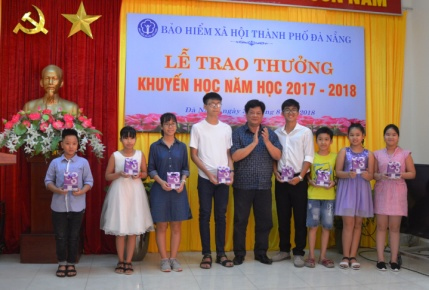 | Ông Phạm Quốc Khánh-Chánh Văn phòng, Chủ tịch Công đoàn BHXH TP Đà Nẵng (đứng giữa) trao học bổng các cháu đoạt giải kỳ thi HSG, năng khiếu các cấp. |