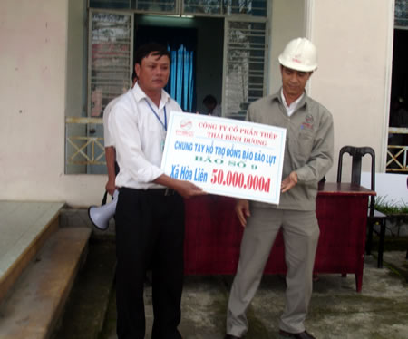 Ông Nguyễn An-Tổng Giám đốc Cty Cổ phần thép Thái Bình Dương trao 50 triệu đồng giúp 100 hộ dân tại xã Hòa Liên bị thiệt hại do bão số 9 gây ra. |