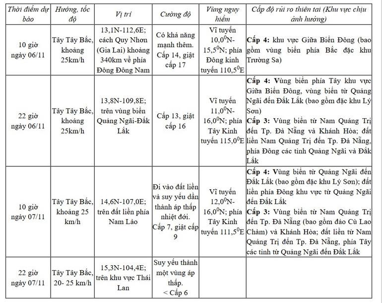 Từ ngày 6-7/11, khu vực từ thành phố Đà Nẵng đến Đắk Lắk có mưa rất to với lượng mưa phổ biến 200-400mm/đợt, cục bộ có nơi trên 600mm/đợt; khu vực từ nam Quảng Trị đến thành phố Huế, Khánh Hòa và Lâm Đồng có mưa to với lượng mưa phổ biến 150-300mm/đợt, cục bộ có nơi mưa rất to trên 450mm/đợt. Từ ngày 8/11 mưa lớn ở các khu vực nói trên có xu thế giảm.